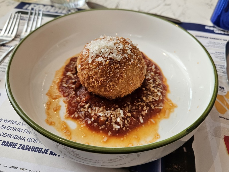 Do wyboru były dwa menu: mięsne i wege. Opcja mięsna zaczęła się od arancini z kaczką i Pecorino Romano - chrupiące na zewnątrz, kremowe w środku, z wyraźnym, ale nieprzytłaczającym aromatem sera. Idealny początek uczty!