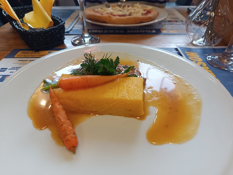Danie główne, czyli saltimbocca - tradycyjne włoskie danie z cielęciny - podane z podpiekaną polentą, młodą marchewką i redukcją balsamiczną, kontynuowało tę podróż. Smaki były wyraźne, harmonijne i konsekwentnie utrzymane w śródziemnomorskim charakterze.