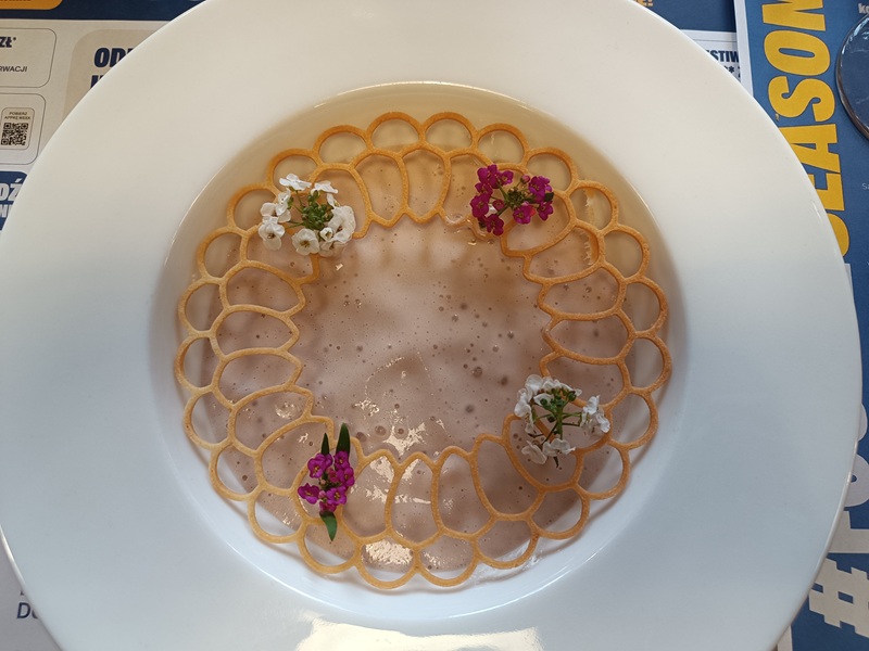 Deser w postaci zabajone z winem miał formę lekkiej piany podanej na zimno z subtelnym tiulem pomarańczowym i jadalnymi kwiatami smagliczki. Stanowił eleganckie i nieco bardziej finezyjne zwieńczenie tej części menu.