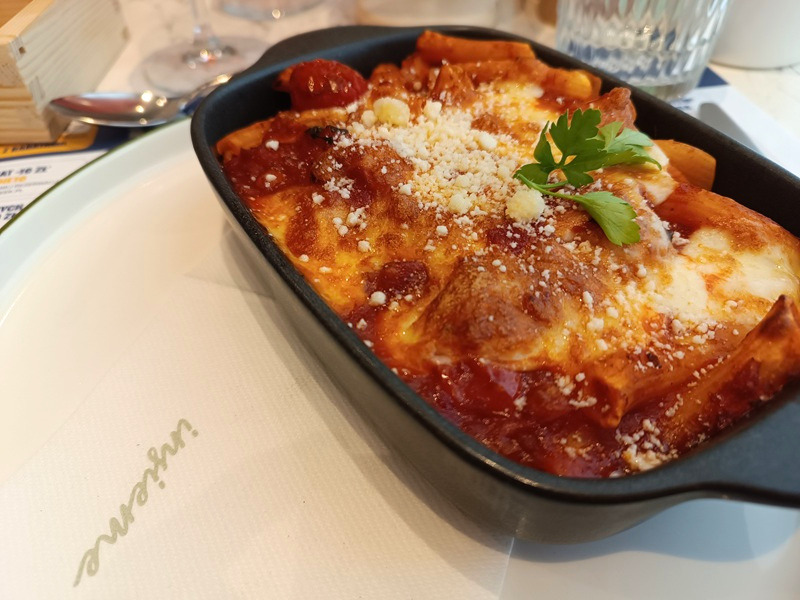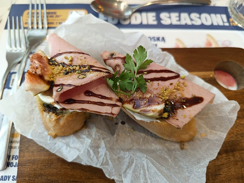W Menu A przystawka w postaci bruschetty z mortadellą, pistacjami, figami i octem balsamicznym łączyła subtelną słodycz owocu z wytrawnym charakterem wędliny. Danie główne - podsmażane gnocchi z guanciale, masłem szałwiowym, parmezanem i szafranem - było aromatyczne, lecz nienachalne w smaku; jednocześnie mogłoby być nieco bardziej intensywne. Deser, czyli tiramisu z musem czekoladowym, stanowił dopełnienie posiłku.