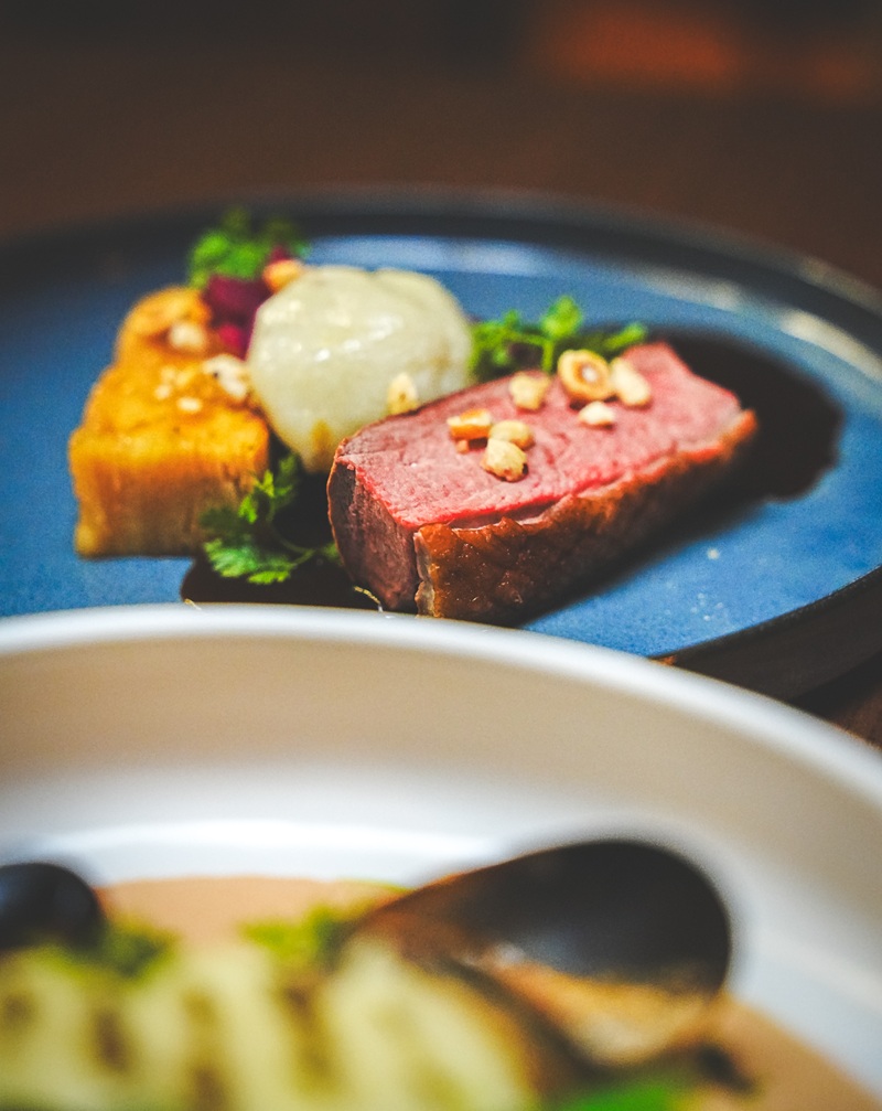 Największą sympatię gości zdobył filet z kaczki przygotowywany metodą sous-vide, podawany z czerwoną kapustą duszoną w porto, delikatną pyzą ziemniaczaną, terriną jabłkową oraz chrupiącymi orzechami laskowymi, całość dopełniona aksamitnym sosem demi-royal. Danie zachwycało harmonią smaków, elegancką prezentacją i wyraźnym nawiązaniem do kuchni autorskiej, łączącej klasykę z nowoczesnym podejściem.