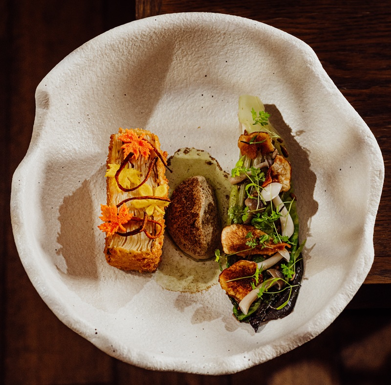 Puree z grillowanej marchwi, róża z grillowanej cukinii, pieczony borowik